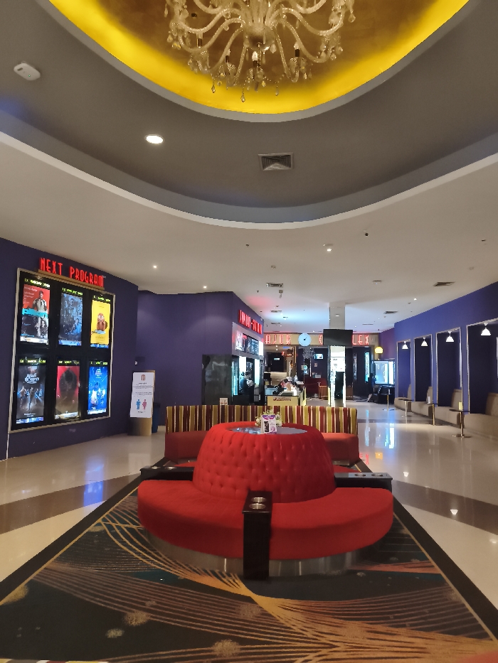 The image captures an interior view of a cinema lobby. A circular red seating area occupies the center, resting on a patterned carpet. In the background, movie posters line a purple wall, beside a sign indicating sanitary measures. Further back, a concession stand is visible, with the cinema's name in neon lights overhead. A chandelier hangs from the ornate ceiling. The lighting is bright and the overall aesthetic suggests a modern, upscale entertainment space.