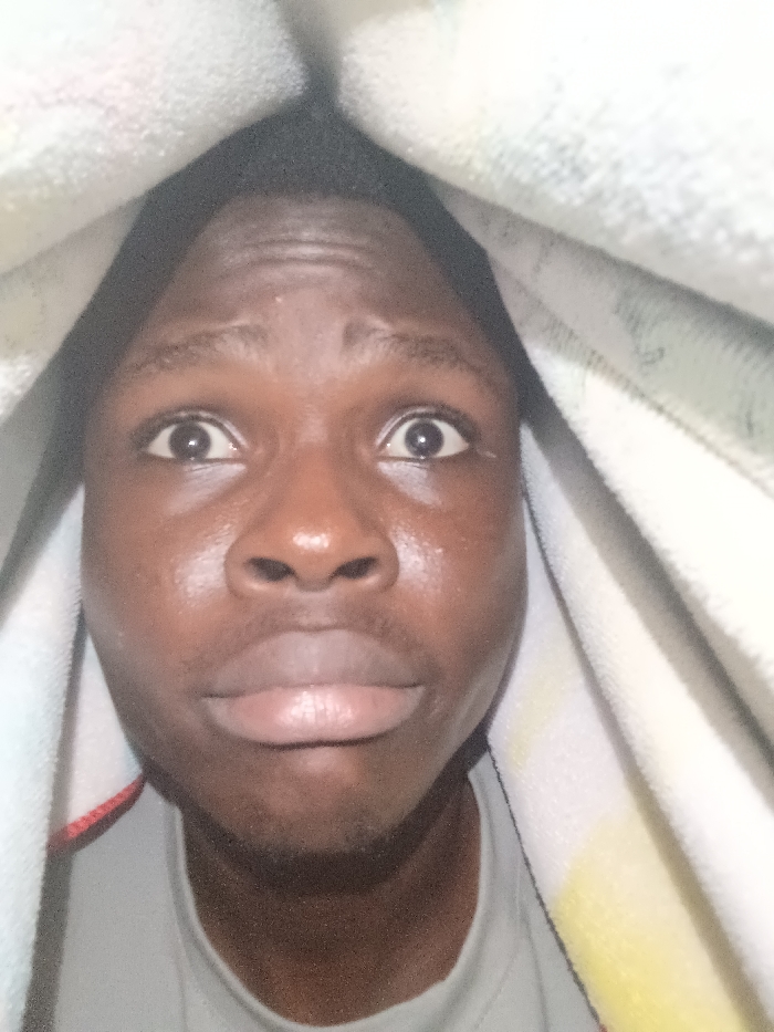A close-up, slightly distorted self-portrait features a dark-skinned person with large, expressive eyes gazing upward. A white towel is draped over the person's head, framing the face. The individual's lips are full, and the skin has a slightly glossy texture. A light gray garment is visible beneath the chin. The overall image appears somewhat amateurish, possibly taken with a phone camera.