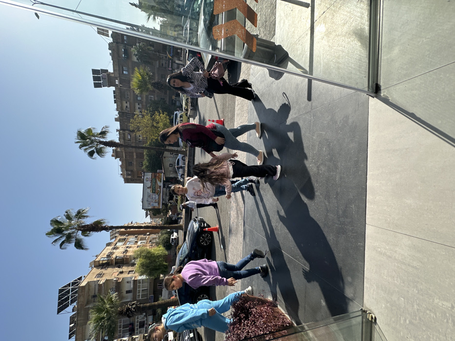 The image depicts a sunny urban street scene in Barza Municipality, Syria, on a clear day with a blue sky and strong shadows. Seven individuals, predominantly female, are observed walking from left to right across a dark gray paved sidewalk in the foreground. From left to right: 1. A person in a light blue tracksuit, partially visible, walking. 2. A young female in a light purple long-sleeved top and dark jeans, walking. 3. A young female in a light-colored long-sleeved top with a design and dark pants, walking. 4. A smaller child, female, in a light pink long-sleeved top and dark pants, walking slightly behind and to the right of Person 3, facing partly away from the viewer. 5. An adult female in a dark red long-sleeved top, light blue jeans, and flat shoes, carrying a dark shoulder bag, walking alongside Person 4. 6. An adult female in a black and white zebra-striped long-sleeved top, black wide-leg pants, and flat shoes, carrying a light pink handbag, walking behind Person 5. 7. A male figure in a light uniform is visible further in the background on the street. The immediate foreground features a lighter-colored tiled surface, transitioning to the darker gray sidewalk. To the far right, a reflective glass panel with a partial image of orange arrows is visible. On the far left, a low planter contains dark red foliage. The midground includes a paved street with multiple parked vehicles, including a dark SUV behind Person 2, and an orange traffic cone near the curb. The background displays multi-story residential or commercial buildings, many exhibiting visible solar panels on their rooftops. Several tall palm trees are interspersed throughout the scene, and a large billboard with advertisements is visible in the distance on the right side of the street.
