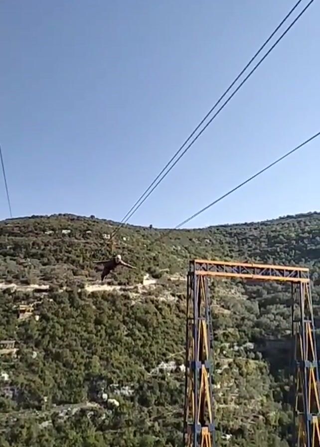 A person is zip-lining high above a landscape of trees and hills. The person is wearing dark clothing and a white helmet. They are suspended from cables and are traveling towards the camera. The background is a clear, blue sky. A metal structure with yellow and black supports is in the foreground.
