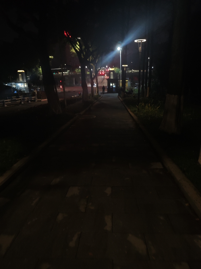 This is a nighttime photograph captured in the Chongqing High-tech Zone, China, looking along a paved pedestrian pathway. The scene is dominated by low light, with artificial illumination sources providing visibility. The pathway, composed of dark-toned paving slabs, occupies the lower and central portion of the image, receding into the distance. On the left side of the pathway, a strip of dark ground is bordered by several trees with visible trunks and sparse foliage against the dark sky. Beyond these trees, a multi-lane road is discernible, featuring vehicle headlights and red taillights, indicating traffic flow. A red traffic light is visible on the far side of the road. In the far distance on the left, illuminated architectural elements of buildings are present. On the right side of the pathway, a similar strip of dark ground and vegetation runs parallel. A tall, modern street light with a strong, directional beam of white light stands in the mid-ground, casting light across the scene. Further down the road on the right, a small, illuminated booth-like structure is visible, adjacent to which a single human silhouette stands upright, facing away from the camera. Another tall, decorative street lamp featuring a circular light fixture is present further down the right side. The overall environment is dark, with strong contrasts between illuminated areas and deep shadows, highlighting the artificial light sources and the shapes of trees and structures.