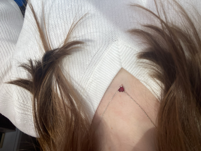 The image displays the upper torso of an individual, featuring light brown to auburn hair framing the left side of the neck and shoulder. The individual wears a white, V-neck, ribbed knit sweater. A thin, silver-colored chain necklace with a small, heart-shaped, dark red or ruby-colored pendant is centrally positioned on the sternum. The background is out of focus, indicating an indoor setting, with no discernible details to determine a specific location within the city of Sofia, Bulgaria. No actions or interactions are evident.