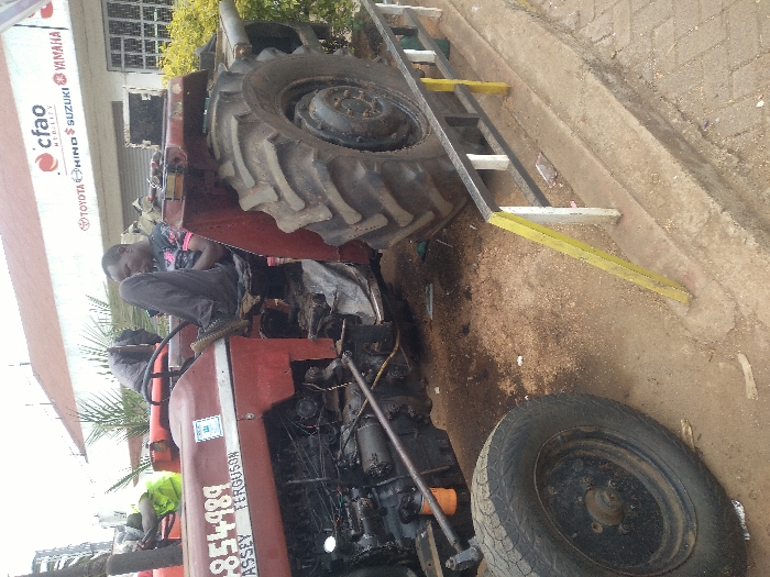 A red Massey Ferguson tractor, marked "854-989" and "MASSEY FERGUSON" on its side, is positioned on a dirt ground with scattered debris. Two adult males are present around the tractor. One male, wearing a dark patterned shirt and dark trousers, is seated on the tractor's seat, looking downwards. A second male, clad in a neon yellow-green shirt and dark trousers, is partially visible near the tractor's engine compartment, appearing to be engaged in work or inspection. The tractor's engine bay is exposed. To the immediate right of the tractor is a concrete curb delineating the dirt surface from a paved sidewalk constructed with rectangular blocks. A metal barrier, featuring yellow diagonal supports and white/grey horizontal and vertical bars, is installed along this curb. In the background, a white commercial building displays a prominent "cFAO MOBILITY" sign, accompanied by logos for TOYOTA, HINO, SUZUKI, and YAMAHA. Green vegetation is visible between the tractor and the building. The scene is situated outside a CFAO Mobility dealership in an urban or semi-urban environment of Unknown, Unknown.