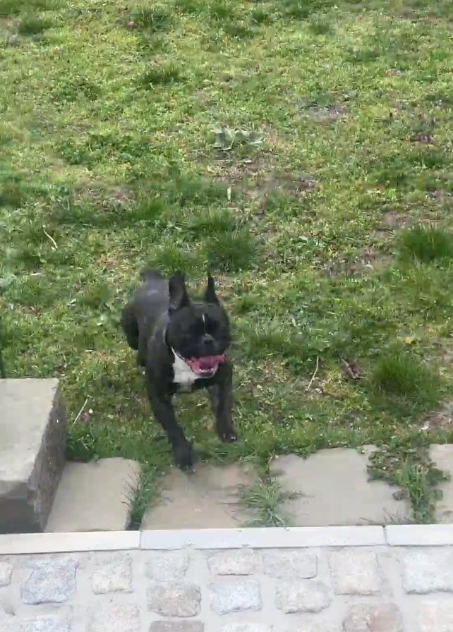 - "brindle French bulldog walking on a stone patio and grass lawn" by FM-0H3GG3, licensed under CC BY 4.0