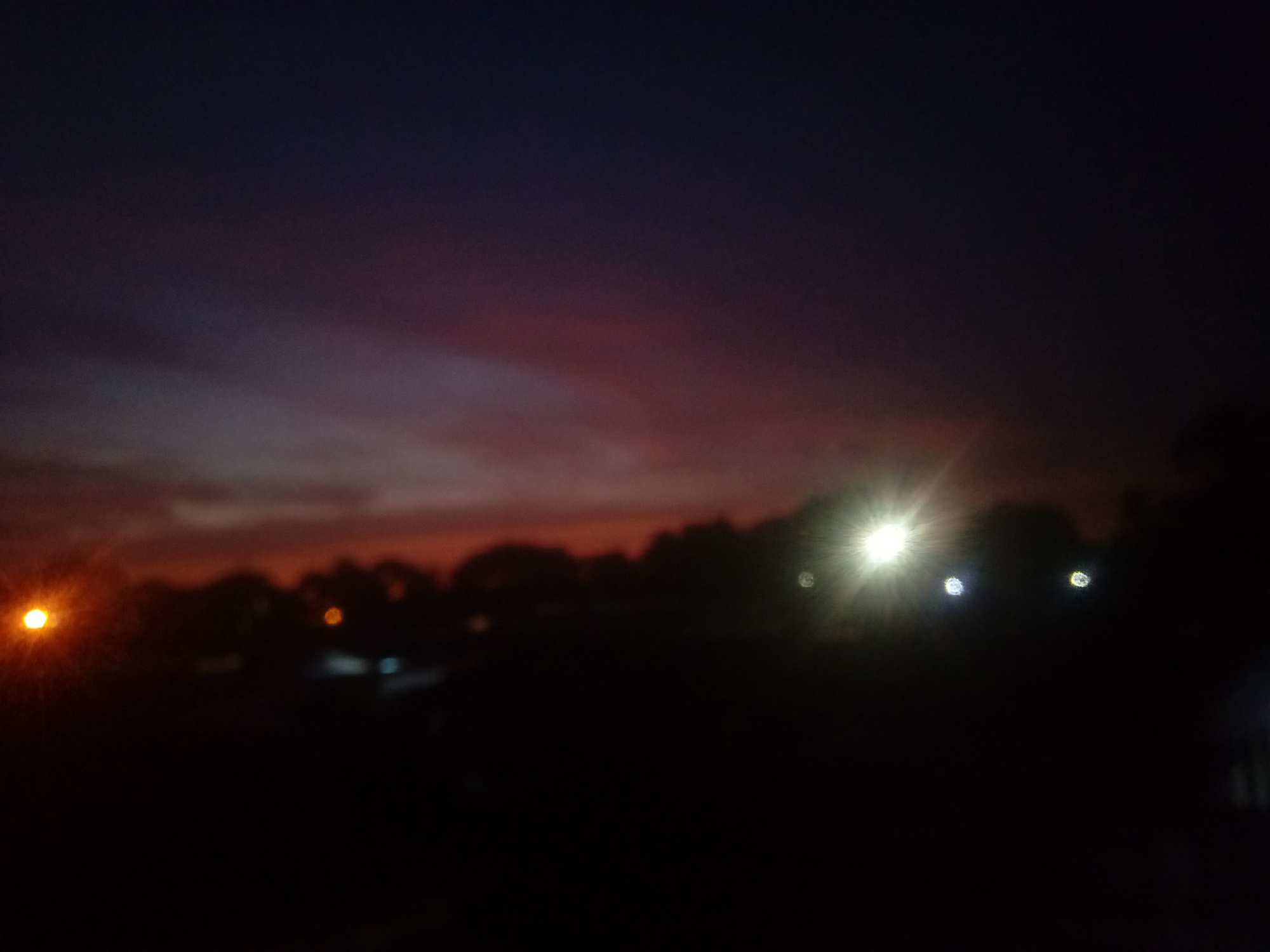 The image depicts an out-of-focus, low-light scene likely taken at twilight or night