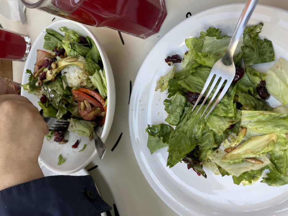 Two plates of partially eaten salads are displayed. One plate is a white, shallow bowl filled with lettuce, tomatoes, cranberries, and seeds, accompanied by a hand and silverware. The other is a white plate with lettuce, cranberries, and seeds, pierced with a silver fork. A glass pitcher containing a dark red liquid stands in the background. The table surface is light with dark dashes.