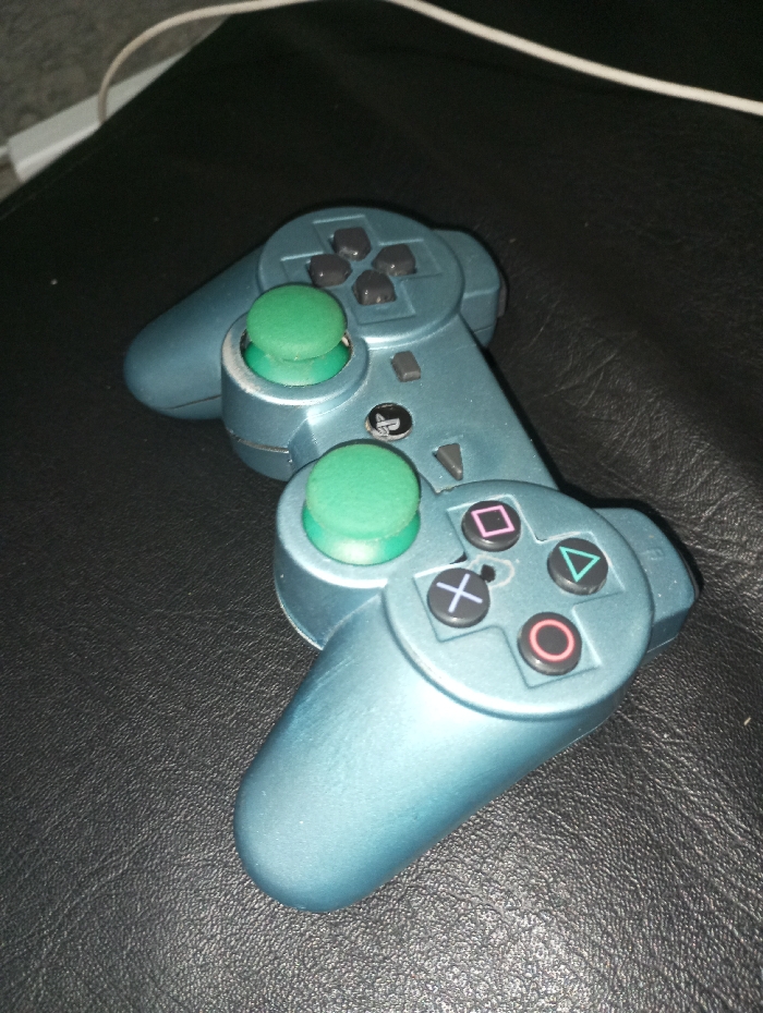 - "The image displays a teal-colored, wireless PlayStation DualShock-style controller resting on a dark, textured surface, located in Wrocław, Poland" by FM-a9LKm1, licensed under CC BY 4.0