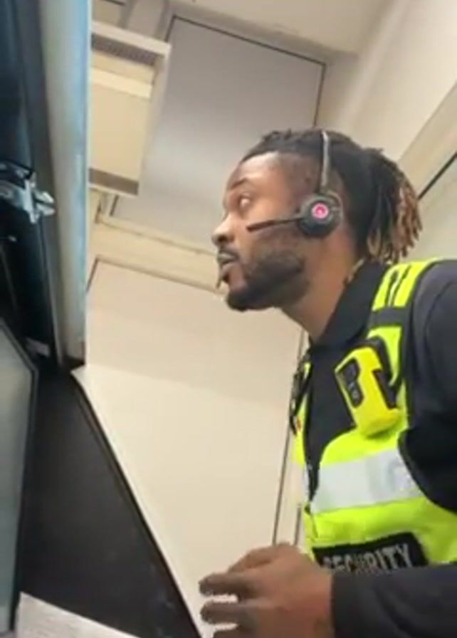 Here's a detailed description of the video: A man is the subject of the video, wearing a bright yellow security vest with "SECURITY" printed on it. He has dreadlocks pulled back in a half ponytail style and is wearing a headset with a microphone. He has a dark complexion, a trimmed beard, and a piercing in his left nostril. The man is positioned inside what appears to be a control room or office. He is standing near a desk with paperwork and appears to be looking at computer screens that are slightly out of view. He gestures with his hands as he speaks, looking directly into the camera at times. The environment is indoors. The room appears to be well-lit, with visible components of an air conditioning or ventilation system. The walls are white. There are window panes visible to the right.