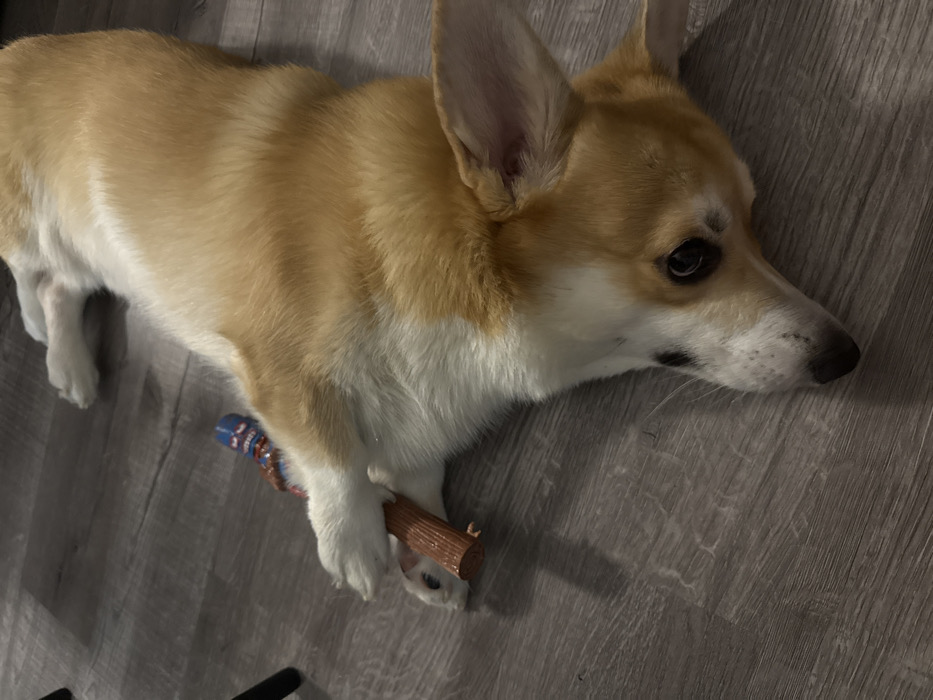 - "A tan and white corgi is lying on a gray wood floor" by FM-foIyE2, licensed under CC BY 4.0