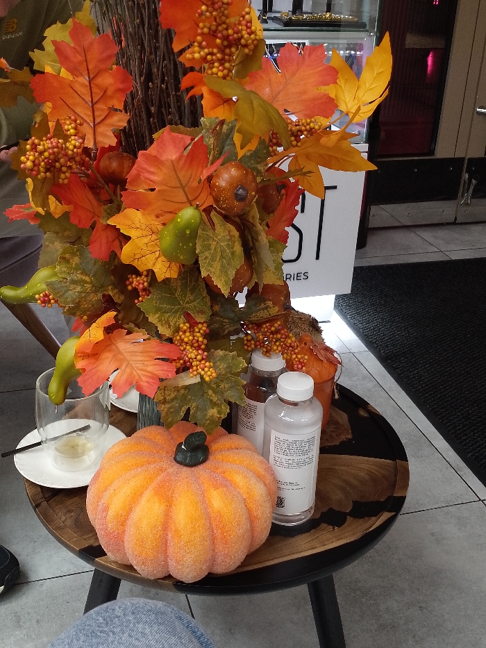 The image displays an indoor scene in Sofiivska Borshchahivka, Ukraine. A round wooden side table with dark metal legs occupies the center, featuring a prominent artificial autumn decorative arrangement. This arrangement consists of numerous artificial leaves in shades of orange, red, yellow, and green, along with clusters of small yellow-orange berries and several artificial green and brownish-orange gourd-like objects, all emerging from a dark, twig-like base. On the table, an artificial, textured, orange pumpkin with a dark green stem is positioned in the foreground. To its left, a clear, double-walled glass containing a light-colored liquid and a black stir stick rests on a white saucer. Behind the pumpkin, two clear plastic bottles with white caps are present; the bottle on the right features a white label with discernible black text. A smaller orange decorative pumpkin is partially visible behind the bottles and the main arrangement. In the background, a vertical white sign with black text, partially reading "ST" at the top and "RIES" below, stands next to a reflective glass display case. The floor transitions from light grey tiles beneath the table to a black mat on the right. A person's lap, clad in light blue jeans, is visible in the lower left corner, indicating an individual seated at the table.