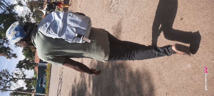 The image displays an outdoor street scene in Homa Bay, Kenya, under clear daylight. A dark-skinned individual, observed from behind, walks away from the camera, moving from the right side of the frame towards the left. This person wears a blue and white patterned baseball cap, a light olive green short-sleeved collared shirt, dark grey or black jeans, and brown open-toed sandals. A light blue backpack with multiple compartments and a white tag is worn on their right shoulder. A dark watch is visible on their left wrist. The ground is an unpaved, light brown surface, likely dirt or gravel, showing faint tire tracks. A prominent, elongated shadow of the walking individual is cast on the ground to their right. In the middle ground on the left, a paved road with a white line is visible, beyond which a light blue minibus is partially obscured by foliage and a fence. Further back, buildings with reddish-brown tiled roofs are present. Tall trees with dense green foliage line the road, casting dappled shadows. On the right side of the frame, a small child, wearing a red top and light-colored trousers, walks further down the path in a similar direction to the main subject. Behind the child, white, tent-like structures, possibly market stalls, are visible. The sky above is a clear blue with minimal cloud cover. An overlaid text annotation, "police kombo 💕💕", is present in the lower-left corner of the image.