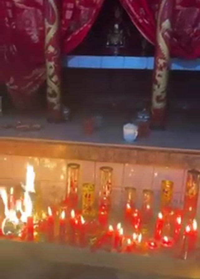 interior of a religious shrine, dominated by red decor and numerous lit candles