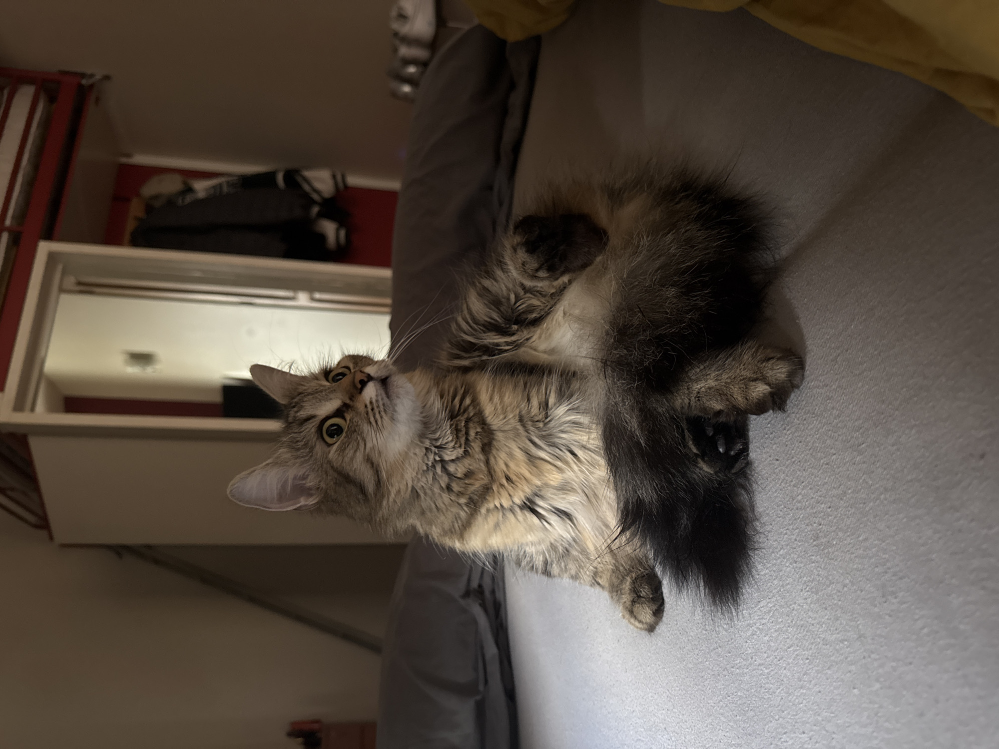 A fluffy tabby cat is lying on its back on a grey surface, possibly a bed or sofa. The cat is looking up and slightly to the left, with its paws curled. Part of the cat's tail is visible. In the background is what appears to be a wall, and a built-in shelf with items on it. Behind the shelf, there's a red frame. The lighting is soft, with a light source from above. There's no evidence to suggest the picture was taken in Antwerp, Belgium.
