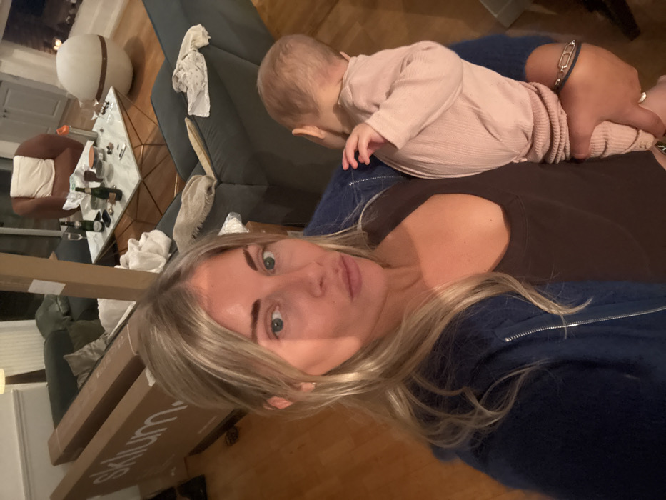 The image displays an adult female holding an infant in what appears to be a residential living room located in Rueil-Malmaison, France. The female, positioned prominently in the foreground, has long blonde hair and blue eyes, gazing directly at the camera with her lips pursed. She is dressed in a dark brown v-neck top underneath an unzipped navy blue cardigan. Her right arm is visible, adorned with a bracelet featuring a dark rectangular element. She is holding an infant, whose back is towards the camera, clad in a light pink, ribbed, long-sleeved outfit. The background reveals a room with light hardwood flooring. A dark grey/green sectional sofa is visible, appearing somewhat disarrayed with light-colored fabrics and other items draped over it. In front of the sofa, a rectangular coffee table with a white marble top and a gold-colored geometric metal base holds two empty champagne bottles, two champagne flutes, a white bowl, a clear glass, and miscellaneous small objects. Further back, an upholstered, light-colored armchair and a large, light-toned spherical object with a dark horizontal band are present. To the left, two large cardboard boxes, one partially displaying the "sklum" logo, are leaning against a surface. Warm artificial lighting illuminates the interior, and a dark, indistinct area in the far background suggests an exterior view through a window or glass door. The scene indicates a casual, possibly transitional environment with evidence of recent activity or unpacking.
