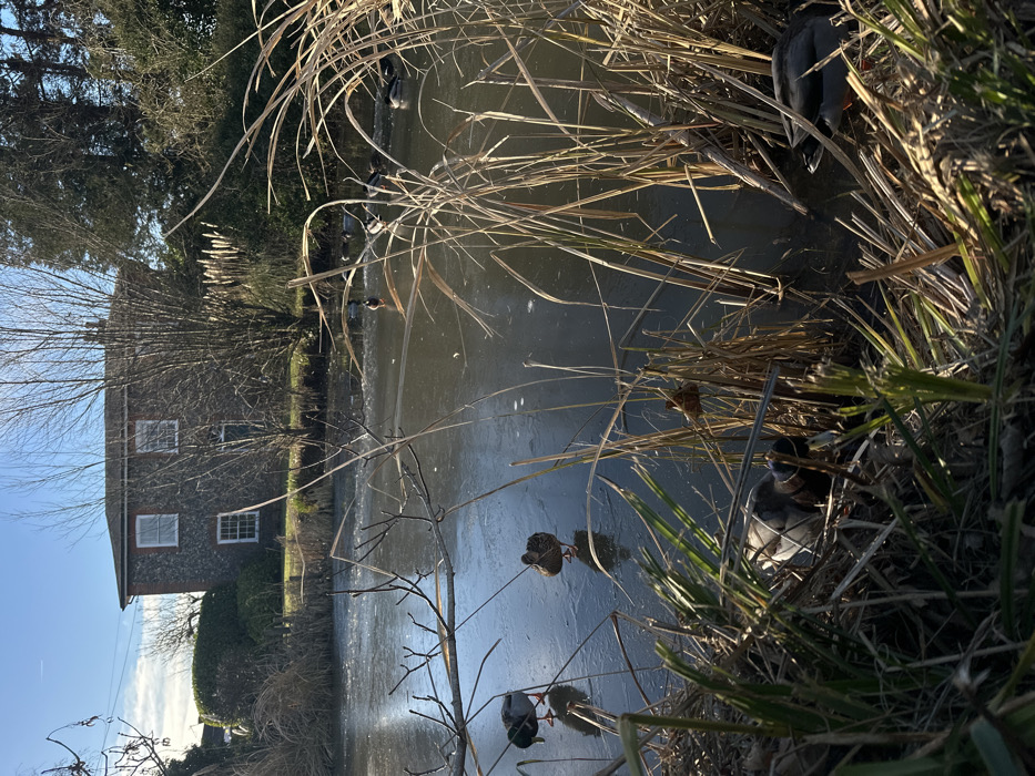 The image presents a daytime winter scene in West Suffolk, United Kingdom, illuminated by direct sunlight under a clear blue sky. A body of water, likely a pond, occupies the midground, its surface largely covered by smooth ice with sections of open water towards the right. The foreground is dominated by tall, dry, straw-colored reeds and bare deciduous branches. Nine ducks are visible: two (one drake, one hen) stand on the ice in the mid-left. Five ducks are swimming or resting in the open water sections towards the middle and right. One drake is partially obscured by reeds in the immediate foreground on the left, and another duck is partially obscured by reeds on the far right. Across the pond, a two-story residential building constructed of dark stone with brick accents around the white-framed windows and roofline is visible. The background also includes bare deciduous trees, green shrubs, and a manicured lawn lining the far bank. Faint aircraft contrails are present in the sky.