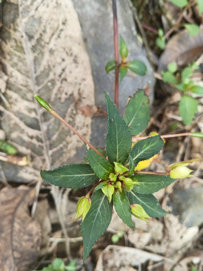 A green plant with pointed, ribbed leaves and a cluster of buds is centered in the frame. The buds are primarily green, with a hint of yellow. A slender, reddish-brown stem extends from one bud. A large, dried leaf rests on the left, and a gray rock provides a backdrop. Smaller green plants dot the right side of the composition. The surrounding area is littered with fallen leaves and plant debris.
