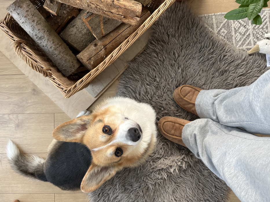 The image depicts an indoor scene in Gangloff, Germany, observed from a downward perspective. A tricolored Pembroke Welsh Corgi dog, with fawn, black, and white markings, is positioned on a grey shag rug, looking directly upward towards the viewer with a slight head tilt. Its tail is visible behind it on the light wooden floorboards. The lower legs and feet of an individual are present in the foreground, clad in light grey sweatpants and brown moccasin-style slippers, resting on the same shag rug. To the upper right, a light brown wicker basket contains various cut firewood logs. A secondary, lighter-colored woven rug with a geometric pattern is partially visible beneath the shag rug on the lower right. A green leafy houseplant and a small, white, tagged plush object are partially visible in the bottom right corner.