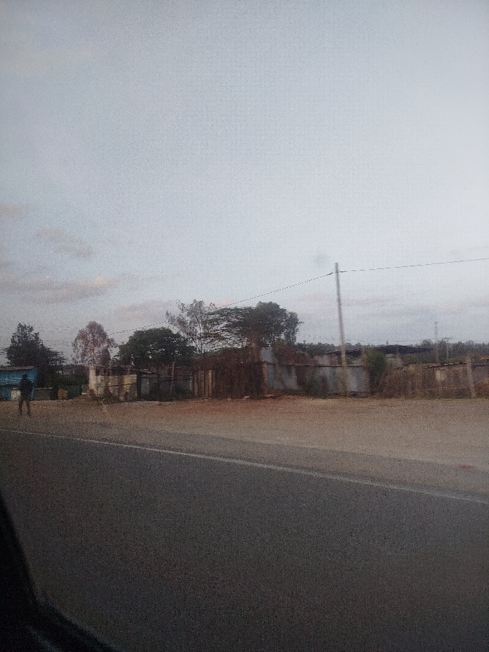 A desolate street scene under a muted sky. A paved road dominates the foreground. Across the road, an unpaved shoulder leads to a row of modest structures constructed with corrugated metal and wood. Scattered trees are sparsely placed along the horizon line. A lone figure walks along the shoulder. An electric pole rises amidst the dwellings, with wires stretching across the sky. The overall impression is one of a rural, possibly economically disadvantaged, locale.