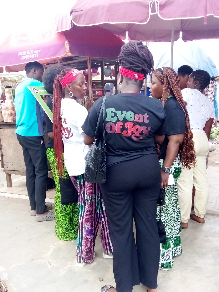 The scene depicts an outdoor gathering in a market area of Iju, Nigeria. Overhead, large maroon umbrellas, one displaying "POWER YOUR DREAM," provide shade. In the immediate foreground, a woman faces away, wearing a black t-shirt with "Event Of Joy" in green and red text, black trousers, and a red headband over dark braided hair; she carries a black faux-croc skin handbag. To her left, a woman in profile has long reddish-brown braided hair with a red headband, wearing a white t-shirt (partially visible "Joy") and colorful patterned trousers, with large hoop earrings. To the right, another woman in profile, with long brown braids, wears a black t-shirt and a green and white patterned skirt, also wearing a watch on her left wrist. Several other individuals, mostly women, are present, some appearing to converse, with one near a pile of green melons on the ground. In the left background, a man in a light blue shirt holds a green triangular sign near a wooden stall with stacked goods. Market stalls displaying footwear are visible further in the background. The ground is paved.