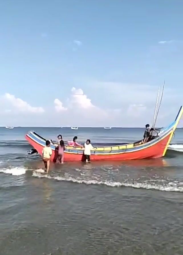 red-orange boat with yellow and blue trim partially submerged in the ocean near the shore. Several people, including children, are standing near or on the boat, some wading in the water. One person is seated at the rear of the boat near a tall, thin pole. The sky is blue with scattered clouds, and the water is calm with small waves. In the distance, other boats are visible on the horizon.