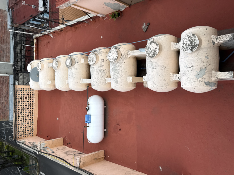 This image depicts an elevated view of a flat, red-orange waterproofed rooftop located within an urban environment in Mexico City, Mexico. Eight weathered, off-white, cylindrical tinacos (rooftop water tanks) are aligned in a row along the right side of the roof, each supported by concrete pedestals and exhibiting surface discoloration and wear. A satellite dish is mounted on the uppermost tinaco. To the left, a horizontal white LP gas tank, visibly branded "TATSA" and equipped with a blue control unit, is positioned on the roof, connected by black piping. The rooftop is bordered by light-colored parapet walls; a terracotta-colored lattice brick wall is visible on the far side. Beyond the left parapet, a street with a pedestrian zebra crossing and trees is discernible. Yellow electrical conduits are affixed to the left parapet wall. Small pieces of debris are scattered on the roof surface. No individuals are present.