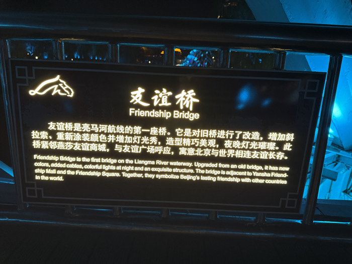 The image displays an illuminated black information panel, presented at a slight angle. Centered on the panel is the title "友谊桥" (Friendship Bridge) in both Chinese characters and English text, with a glowing, stylized white outline of a horse head to its left. Below the title, descriptive text explains that the Friendship Bridge is the first bridge on the Liangma River waterway, upgraded from an old structure with new colors, added cables, colorful lights at night, and an exquisite design. It is adjacent to Yansha Friendship Mall and the Friendship Square, symbolizing Beijing's lasting international friendships. This text is provided in both Chinese and English. The panel is enclosed by a reflective dark frame, exhibiting a traditional Chinese geometric pattern in its corners. The background is dark, with strong ambient blue light illuminating the scene, casting reflections on the panel's surface and the frame, indicating a nighttime or low-light environment. The location is specified as the Liangma River waterway, adjacent to Yansha Friendship Mall and Friendship Square, within Chaoyang District, Beijing, China.