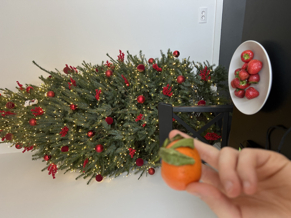 An indoor scene in Antwerp, Belgium, features a hand holding a small, out-of-focus orange fruit with green leaves in the foreground. The fruit appears to be a kumquat or a similar small citrus. In the midground, a dark-colored table holds a white plate containing approximately a dozen fresh red strawberries with green caps. To the left of the plate, a black electronic device or cable is partially visible. The background is dominated by a tall, heavily decorated Christmas tree, adorned with numerous warm white string lights, various red spherical ornaments (some smooth, some textured), and clusters of artificial red berries. A small white ornament resembling a polar bear is visible near the top of the tree. A black chair with a cross-back design is partially visible in front of the tree, behind the held fruit. The wall behind the tree and table is a plain light color, likely white or off-white, and features a white double electrical outlet (Type E/F) on the right side. The floor in the lower right corner is dark.