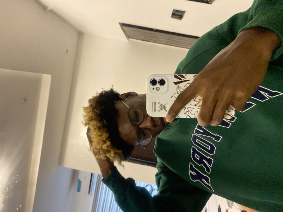 A male individual is depicted in a mirror selfie, captured indoors in Igboefon, Nigeria. The subject, with dark skin, wears dark-rimmed circular glasses and a dark green long-sleeved sweatshirt featuring the reversed text "YORK." His hair is dark at the roots with noticeable blonde or light brown tips, styled upward. He holds a white smartphone, equipped with a white case displaying a "ONE PIECE" skull and crossbones emblem along with other graphic elements, in his right hand, angled towards the mirror. His left hand is raised, with fingers touching the upper left side of his hair. The reflected background reveals light-colored walls, a multi-tiered white ceiling, a white split-unit air conditioner partially visible in the upper left, and a dark brown panel door on the right.