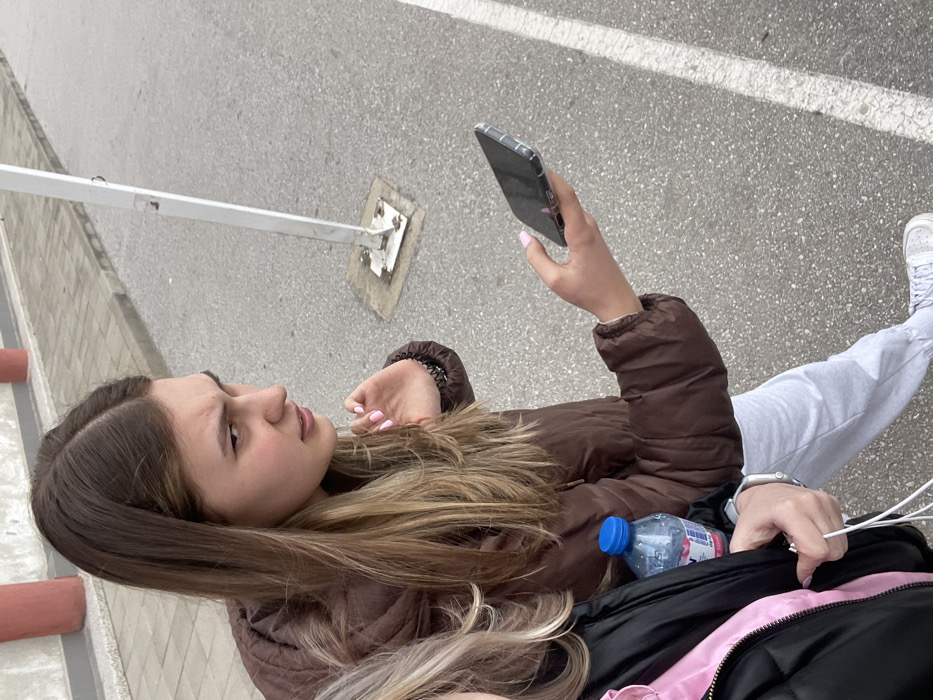 The image depicts two individuals in an outdoor urban setting, likely a street or parking area adjacent to a sidewalk, under overcast daylight conditions. The primary subject, on the right, is a female with long, light brown hair. She wears a dark brown puffer jacket, light grey sweatpants, and white sneakers. Her left hand is partially raised, displaying pink nail polish, with a black hair tie on her wrist. Her right hand holds a dark-colored smartphone horizontally, encased in a clear cover, with the screen facing away from the viewer. Her facial expression shows a slight frown and narrowed eyes, directed towards the right side of the frame. A second individual is partially visible on the far left, wearing a black puffer jacket over a pink garment. This person's hand is visible, holding white earbuds or a cable, and a silver watch is on their wrist. A blue plastic water bottle with a red and white label is tucked into or held adjacent to their jacket. The ground is grey asphalt pavement, featuring a faded white line running horizontally towards the right. A light grey concrete or stone block sidewalk is visible behind the primary subject, paralleling the asphalt. In the background, beyond the sidewalk, a light-colored wall with a reddish-brown vertical accent or column is present. A white metal pole, anchored to the asphalt by a square metal plate and four bolts, stands between the primary subject and the background. While the city of Panagyurishte, Bulgaria, is specified, the image contains no discernible landmarks or specific signage to pinpoint a precise location within that city; the environment appears to be a generic street or pedestrian area.