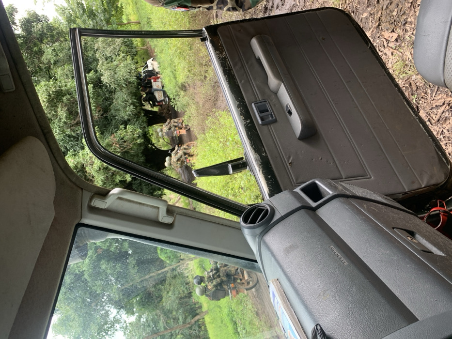 The image depicts a rural or semi-rural scene in Mkavior, Nigeria, viewed from the interior of a vehicle, likely an SUV or pickup truck. The front passenger door is open, revealing the grey interior door panel with its handle, window switch, and general wear. The dashboard, A-pillar, and a sun visor are also visible inside the vehicle, with "SRS AIRBAG" printed on the glove compartment area. Outside the vehicle, a muddy, unpaved track extends into a densely vegetated area with numerous trees and green foliage under an overcast sky. On this track, two individuals wearing military-style camouflage uniforms, helmets, and tactical gear are riding a motorcycle away from the camera. The driver and passenger both have significant backpacks or equipment. Further down the track, beneath a large tree, a white Toyota pickup truck is visible, with multiple individuals (approximately 4-6) in its bed, also appearing to wear dark clothing or uniforms, some possibly armed with rifles. On the far right edge of the frame, a partial view of another person in a camouflage uniform is visible, standing outside the camera's vehicle. The overall scene suggests a patrol or movement of armed personnel in an off-road environment.