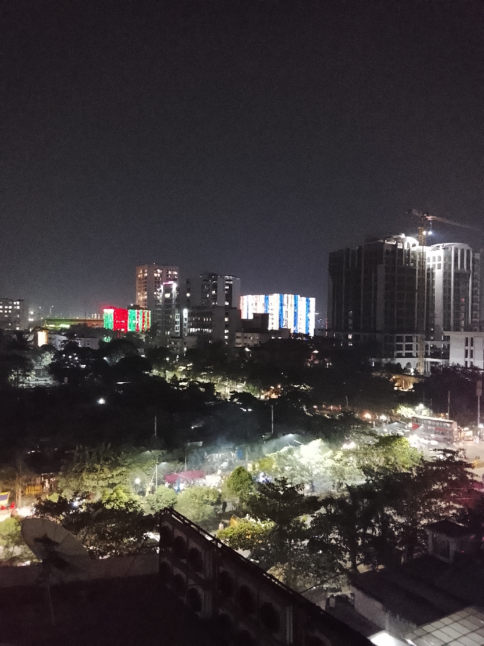 This image depicts a nighttime cityscape in Dhaka, Bangladesh, captured from an elevated perspective. The upper third of the frame shows a dark, featureless night sky. In the midground and background, numerous multi-story buildings illuminate the horizon. On the left side, a building is prominently lit with vertical red and green light stripes. To its right, another building displays vertical blue and white light stripes. Further right, a tall building under construction is visible, topped with an illuminated crane. Many other buildings exhibit various illuminated windows, suggesting occupancy. The midground features a brightly lit open-air market or gathering area situated amongst dark treetops and other vegetation. This area contains numerous white tent-like structures and is illuminated by multiple bright light sources. Undifferentiated human figures are visible within this area, along with what appears to be smoke or haze rising from it. A road runs through the scene, with vehicle lights visible. A red and yellow BRTC bus is parked or moving on the right side of this road. In the immediate foreground, a dark architectural structure, possibly a rooftop or balcony edge, extends across the lower portion of the frame, partially obscuring the lower-left corner. A grey satellite dish is mounted on this structure on the left side.