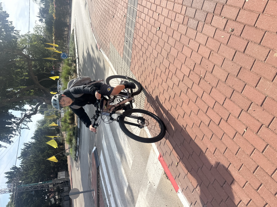 - "A young male, wearing a grey helmet, dark hoodie, dark shorts with an 'LA Lakers' logo, black shoes, and a light-colored backpack, is depicted riding a dark mountain bicycle on a reddish-brown brick sidewalk in Beit Yitzhak-Sha'ar Hefer, Israel" by FM-RIphO2, licensed under CC BY 4.0