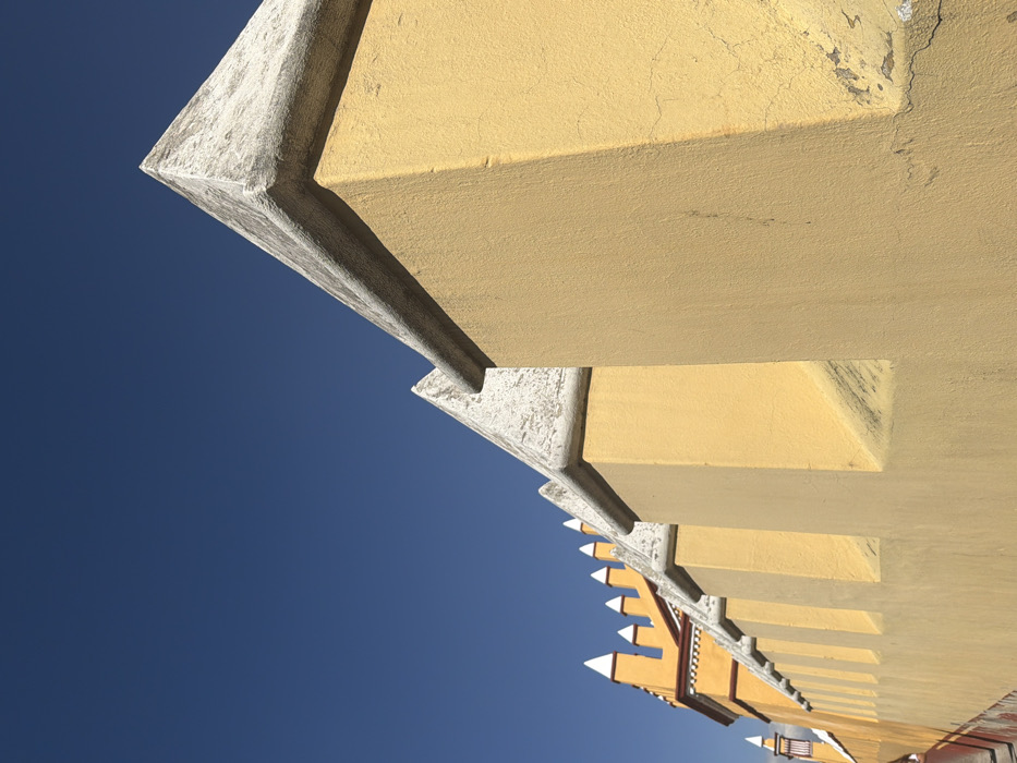 An upward angle shows a yellow building facade against a blue sky. The building's edge is defined by evenly spaced, triangular projections bordered with white trim. The sun highlights the textures of the painted surfaces and casts shadows beneath the geometric shapes. The building's lower portion features additional architectural elements.