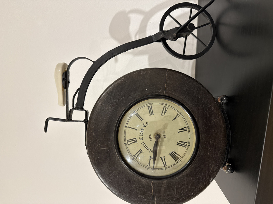 - "A desk clock, crafted in the likeness of an antique high-wheel bicycle, stands on a dark, flat surface against a plain off-white wall" by FM-k1rMm1, licensed under CC BY 4.0