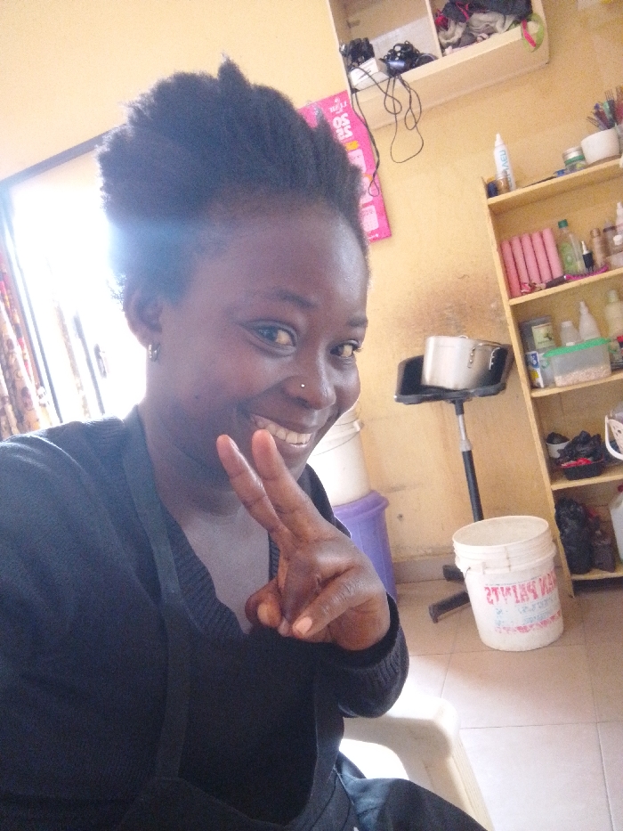 An adult female individual with dark skin and short, textured dark hair is depicted in a close-up, chest-up selfie. She is smiling broadly, showing teeth, and looking directly at the camera. She wears a small silver nose stud on her right nostril and a silver hoop earring in her left ear. Her right hand is raised, displaying a "peace" sign. She is wearing a dark-colored top, possibly black or dark grey, over a lighter inner garment. The background consists of light yellow or cream-colored walls. To the left, a window with patterned curtains (multi-colored, possibly red, brown, and cream floral) allows bright light into the room. Above the window, an open light-colored wooden shelf holds miscellaneous items, and a pink poster or calendar with white text is affixed to the wall. Wires are visible hanging near the shelf. To the right, a tall, narrow, light-colored wooden bookshelf with multiple shelves is present. The shelves contain various bottles, tubes, small containers, and pink cylindrical objects (possibly hair rollers). A white pot containing writing instruments is on the top shelf. Lower shelves show clear and colored bottles and a black bowl with red contents. In the center-right, a silver pot rests on a black adjustable stand or stool. The floor is covered with light-colored tiles. A white plastic bucket with red lettering, including "WAN PAINTS," is on the floor in the lower right, next to a purple plastic bucket. The scene suggests an indoor setting, possibly a small business or personal space, located within the city of Jos, Nigeria.