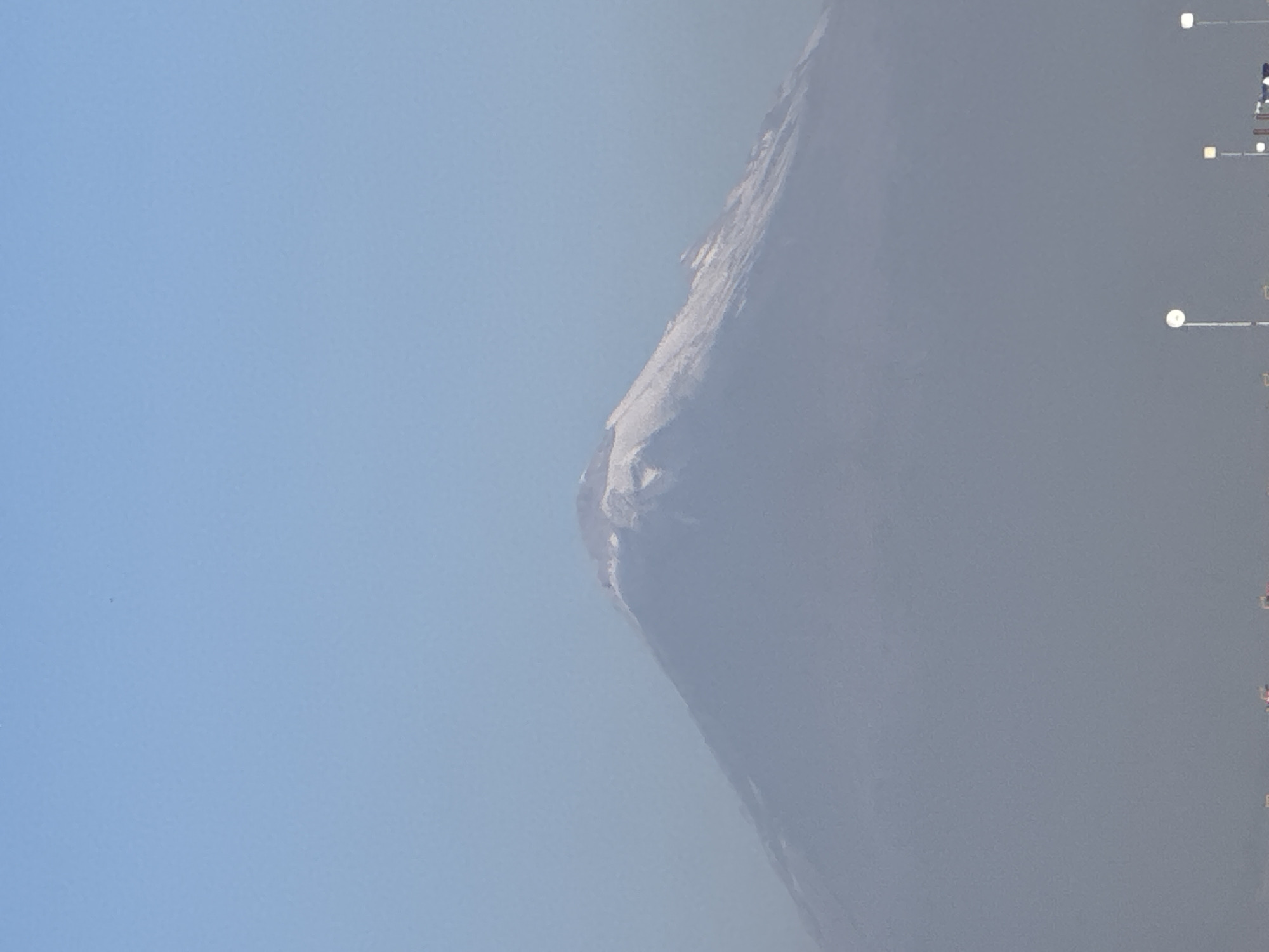 The image displays a distant view of a large stratovolcano, likely Popocatépetl, from the location of San Francisco Ocotlán (Ocotlán), Mexico. The mountain occupies the central and lower portions of the frame. Its peak and upper slopes are covered in white snow or ice, with visible craggy features. The mid and lower sections of the mountain are heavily obscured by a dense atmospheric haze, appearing as a muted gray-blue mass that blends into the distant foreground. Above the mountain, the sky is a clear, light blue. At the very bottom of the frame, partially visible through the haze, are the tops of multiple streetlights, distinguished by their white, circular luminaires. Additional indistinct structures or rooftops are present in the extreme foreground, further blurred by the atmospheric conditions. No individuals are discernible.