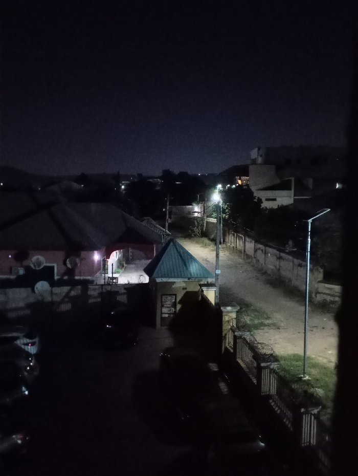 Night scene featuring illuminated street lights casting light on a road. A building with a dark roof sits to the left, alongside a gate with a pyramidal roof. A fence lines the right side of the road. Parked cars are visible in the lower left foreground, partially obscured by darkness. A taller building is noticeable in the distance.