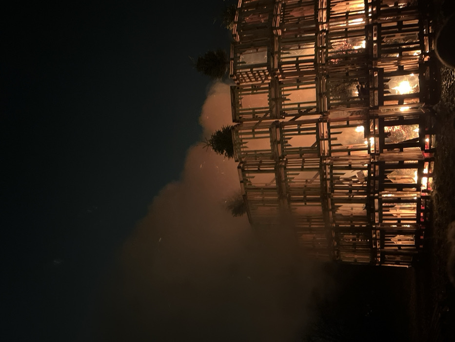 A tall structure composed of wooden pallets is engulfed in flames at night. Orange light from the fire shines through the structure, illuminating the surrounding smoke. Some tree branches are positioned on the pallet structure. The sky is dark, and the ground is partially obscured by smoke and darkness.