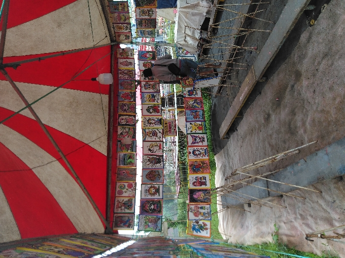 An outdoor scene in Ciwalen, Indonesia, is observed from within a large temporary tent structure featuring a red and off-white striped canopy supported by dark metal poles. The ground within the tent is covered with light-colored sand or dirt, and a narrow, dark-colored elevated wooden walkway extends down the center. Numerous A-frame-like structures, constructed from light-colored poles, are arranged along both sides of the walkway, extending towards the foreground. Approximately two to three rows of framed or laminated pictures are suspended horizontally from wires or strings at eye level across the rear of the tent. These pictures display various cartoon and anime-style characters, including identifiable figures such as Sonic the Hedgehog and Pikachu. An additional vertical display of similar pictures is visible along the left interior wall of the tent. A single white light bulb hangs from the central support pole of the canopy. One individual, seen from the back, stands on the right side of the wooden walkway, facing towards the displayed artwork. They are wearing a light-colored top, dark lower garments, and appear to have a dark bag or item slung over one shoulder. Beyond the tent's open back, green foliage and other distant white structures are discernible under daylight conditions.