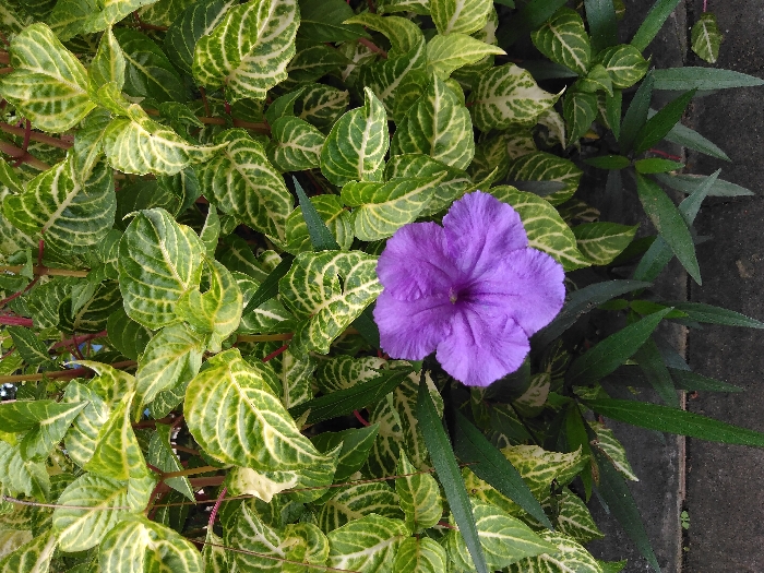 A single vibrant purple flower, featuring five distinct petals and a darker central area, is centrally positioned against a dense backdrop of lush foliage. The background consists primarily of ovate leaves exhibiting a variegated pattern of dark green with prominent lighter green to yellowish-white veins. Thin, reddish-brown stems are visible among the leaves. Below the purple flower, slender, dark green leaves extend towards the bottom edge of the frame. The lowest portion of the image reveals a dark gray, textured surface, consistent with concrete or stone paving. The scene depicts a static outdoor botanical setting in Phou Khoun, Laos.