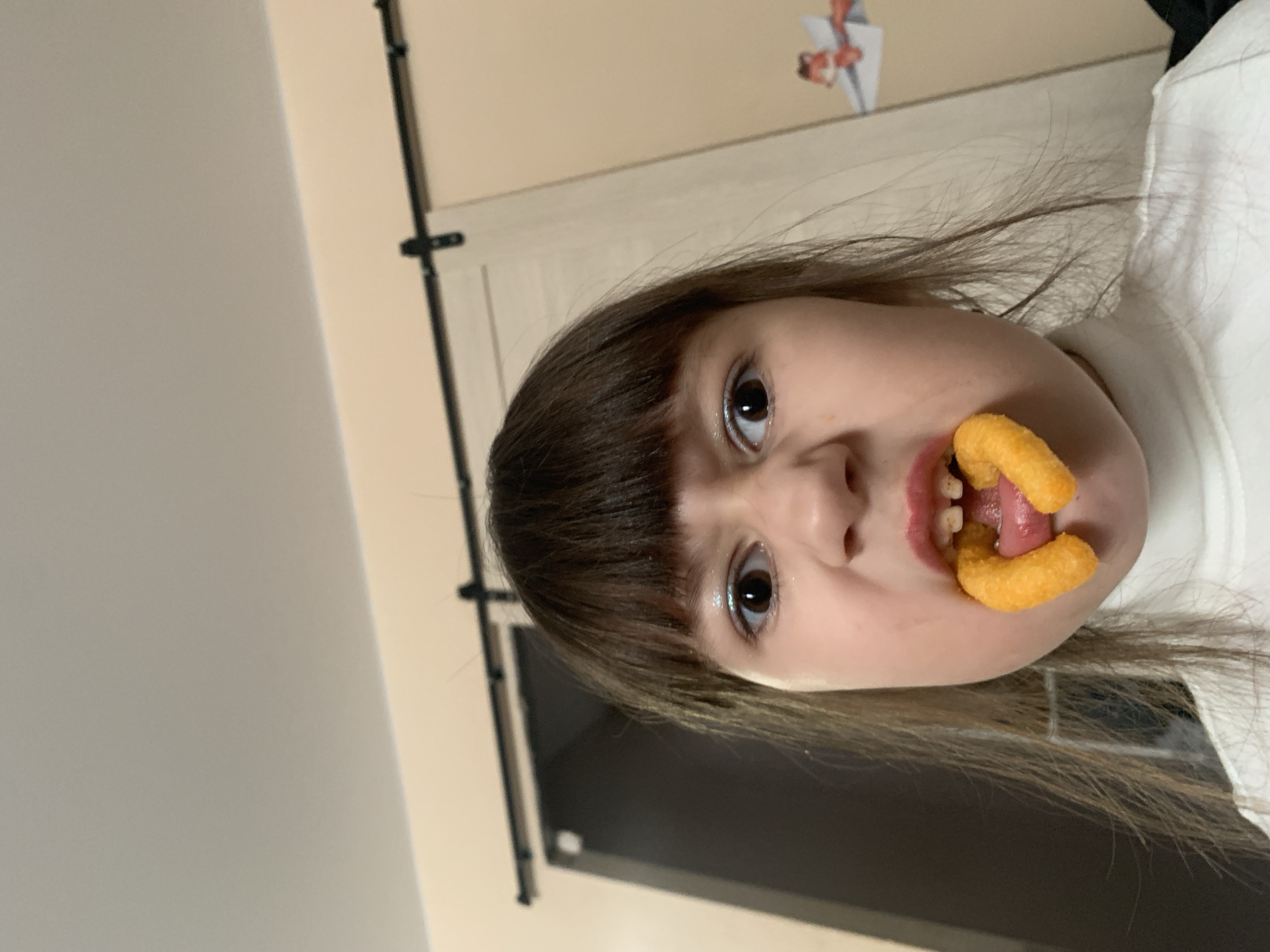 A young girl with dark hair is positioned in the center of the frame, holding two cheese puffs in her mouth. The background is a slightly blurred interior shot of a room with light-colored walls, a black curtain rod, and a door. A sticker is visible on the wall in the upper right corner of the frame. The photograph was not taken in Chaikovsky, Russia. The location is unspecified.