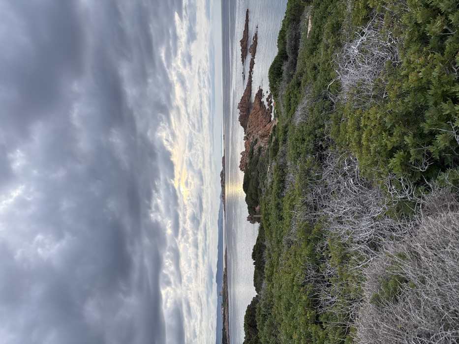 The image depicts a coastal scene in Paduledda, Italy, under an overcast sky. The foreground and midground are dominated by a sloping terrain covered in dense, dark green Mediterranean scrub and interspersed patches of dry, gnarled grey-white vegetation. To the right, a rugged coastline features prominent reddish-brown rock formations extending into the calm, grey-blue sea. A singular, dark, vertical post or marker is visible among the vegetation on the left side of the rocky coast. In the distance, a headland on the far left shows scattered buildings, including a distinct brown tower-like structure. Further into the sea, multiple small, reddish-brown rocky islets are visible. The sky is largely covered by heavy, dark grey stratocumulus clouds, with a narrow horizontal band of lighter clouds near the horizon. A small, bright yellow-white patch of light emanates from a break in the clouds, casting a shimmering reflection across the water's surface. No individuals or overt actions are present.