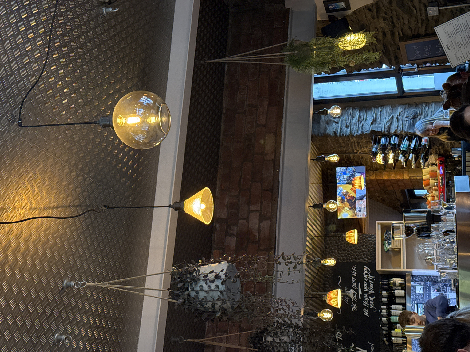 interior of a bar or restaurant in Windermere, United Kingdom. The interior features a mix of textures and materials, including a diamond-patterned metal wall, brick, and stone. Several light fixtures are visible, including large bulb-style pendant lights and smaller sconce-type lights. Potted plants hang from the ceiling, adding a touch of greenery to the space. Behind the bar, shelves hold bottles of wine and spirits. A television screen displays an image, while a blackboard lists information for customers. People are present in the background, including a bartender.