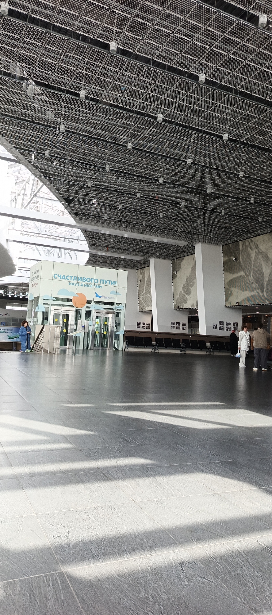 The image depicts the interior of a modern airport terminal in Bolshoye Savino, Russia. The scene is dominated by a spacious, high-ceilinged hall with a grid-patterned perforated metal ceiling featuring numerous white cylindrical pendant light fixtures. Natural light floods the space from large windows and a partial skylight on the left, casting sharp, rectangular shadows across the dark grey, large-format tiled floor. On the left side of the frame, a glass and metal structure with multiple security gates or turnstiles is visible. Above these gates, a large sign displays "СЧАСТЛИВОГО ПУТИ! HAVE A NICE TRIP!" along with graphics of clouds, an orange sun, and a blue airplane silhouette. To the left of this structure, a person wearing a blue puffy jacket stands near a low white counter or kiosk, looking down at an object in their hands. An escalator or staircase descends behind them. The right side of the hall features a series of tall, white rectangular pillars separating large wall panels adorned with abstract grey and white patterns. Below these panels, a row of dark, modern airport seating is arranged, with a few smaller, X-shaped stools positioned in front. Several small, framed pictures are affixed to the lower sections of the pillars. Towards the far right, a small group of three individuals is present. One person, dressed in a white tracksuit and holding a light blue bag, stands facing right. Adjacent to them, another individual in a brown jacket and dark pants stands with their back mostly to the camera. A third person, partially obscured, is also visible within this group, wearing dark attire. No direct interactions are clearly observable beyond their proximity. The overall environment appears clean, well-lit, and orderly, indicative of an active public transportation hub.