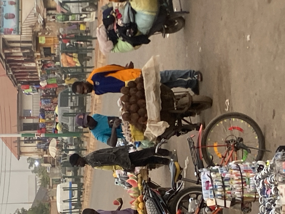 A street scene depicts three vendors with their goods. One vendor has a bicycle loaded with toothbrushes. Another pushes a cart piled high with coconuts and a layer of eggs. A third vendor showcases watermelons and mangoes. The vendors are of African descent. Various shops line the street in the background. One motorcycle carries assorted wares, and the setting appears to be an outdoor market or busy street in a developing country.