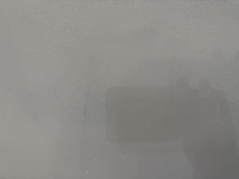 A textured, light gray surface dominates the image. A faint, rectangular imprint is visible near the center, slightly lighter than the surrounding area. Small, scattered imperfections create a slightly bumpy texture. The right side of the image is darker, possibly due to shadowing, with a hazy, indistinct form visible. Overall, the image presents a simple, somewhat uneven, and weathered surface.