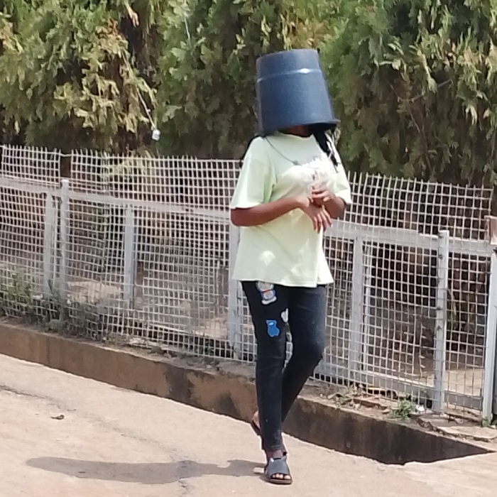 An individual is depicted walking outdoors in Oko Erin, Nigeria, under bright sunlight. The person is wearing a light green short-sleeved t-shirt, dark-colored jeans adorned with patches (including a blue teddy bear and other shapes), and dark open-toed sandals. A dark blue or black bucket is inverted and placed over the individual's head, obscuring their face. Their hands are clasped or folded in front of their waist. The individual casts a distinct shadow on the light-colored paved ground beneath them. In the midground, a low concrete curb separates the paved area from a strip of dirt, behind which runs a white or light-colored metal grid fence. Dense green foliage forms the background.
