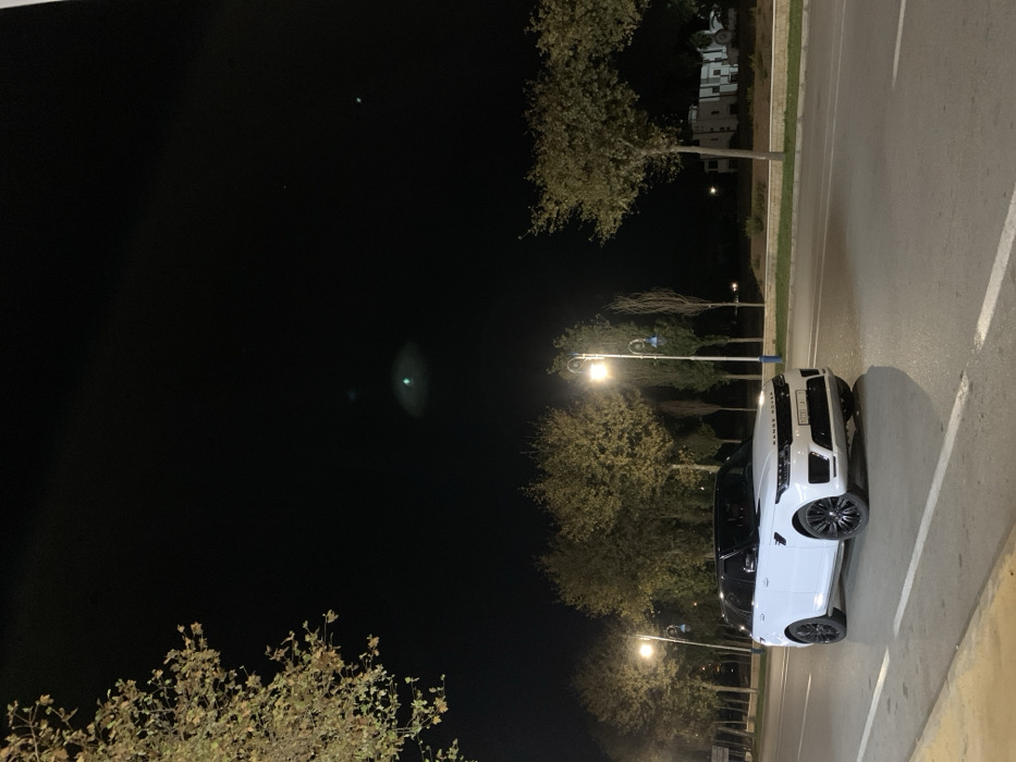 The image depicts a white Range Rover Sport, registration "90791 J 1" (a Moroccan license plate), parked stationary on the right side of a two-lane asphalt road at night in M'diq, Morocco. The vehicle faces the viewer's right, displaying illuminated LED daytime running lights, a black roof, and black multi-spoke wheels. The road surface, marked with a solid white edge line and a dashed white lane divider, reflects light from multiple tall streetlights. These streetlights, featuring warm-toned lamps, are positioned along a paved median or sidewalk strip to the right of the vehicle. This strip is lined with a row of moderately sized, round-canopied trees with green foliage, interspersed with some bare or thinly foliated deciduous trees. The upper left portion of the frame is partially obscured by the branches and light-colored foliage of a larger tree. The sky above is dark, indicating nighttime, with two distinct green lens flare artifacts visible. In the distant right background, beyond the trees, several light-colored buildings are faintly discernible. No individuals are visible in the scene.