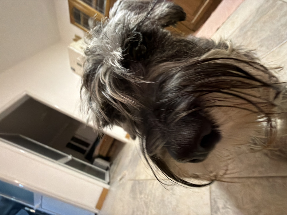 A close-up, slightly tilted image features a gray and white Schnauzer-type dog. The dog's nose is centered and prominent. Its wiry fur covers its face, obscuring its eyes. The background includes a kitchen counter and cabinets on the left and tiled flooring. The lighting is bright, casting soft shadows.