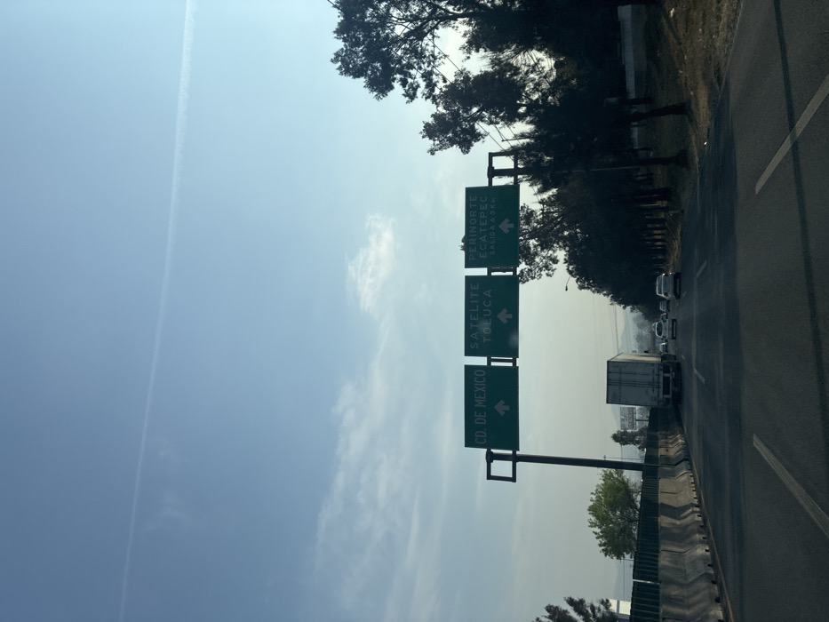 A roadside view shows a highway with multiple direction signs. The signs indicate routes to CD. DE MEXICO, SATELITE TOLUCA, and PERINORTE ECATEPEC, with arrows showing directions. A few vehicles, including a large truck, are on the road. Trees line the highway. The sky is a hazy blue with thin clouds.